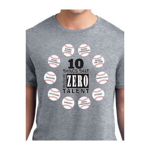 These baseball t-shirts have the 10 Things That Require Zero Talent baseball graphics screened on the chest. 100% cotton.