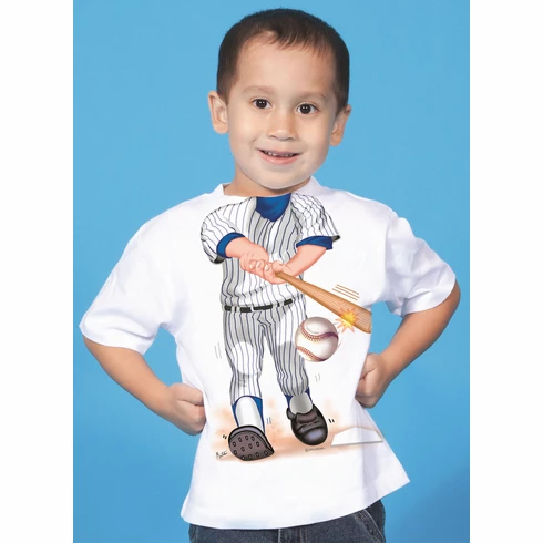 These Add-A-Kid white youth onesies, t-shirts, and bibs are AWESOME – they have the body of a young baseball batter screened on the front.