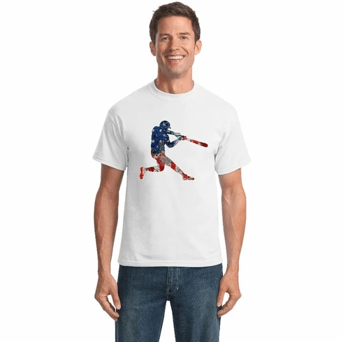 These baseball t-shirts feature the USA flag baseball batter graphics printed on the chest. 100% cotton.