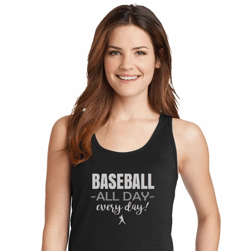 These women’s baseball t-shirts feature the Baseball All Day Every Day graphics digitally printed on the chest.
