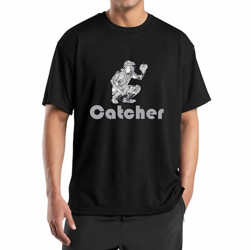 These baseball t-shirts feature the baseball catcher graphics printed on the chest. 100% cotton.