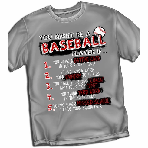 These gray baseball t-shirts have You Might Be A Baseball Player If graphics screened on the front. 100% cotton.