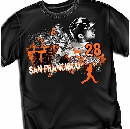 These black baseball t-shirts have the Buster Posey San Francisco Big City graphics screened on the chest. 100% cotton.