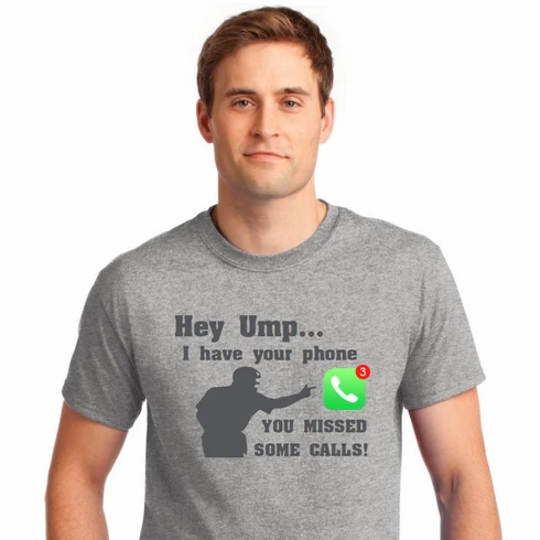 These baseball t-shirts feature the Hey Ump I Have Your Phone You Missed Some Calls baseball graphics printed on the chest. 100% cotton.