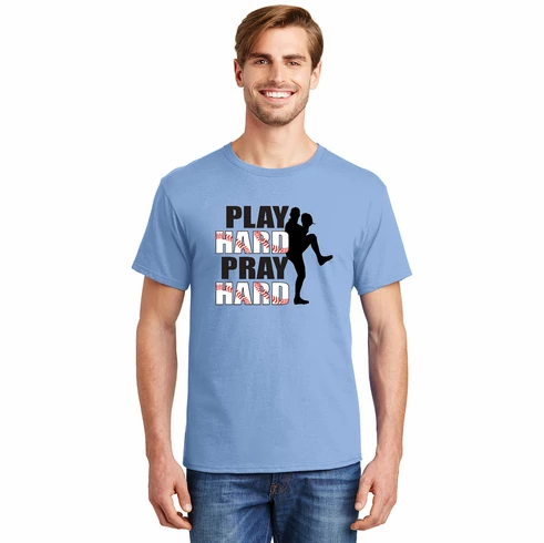 These baseball t-shirts feature the PLAY HARD PRAY HARD BASEBALL graphics printed on the chest. 100% cotton.