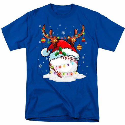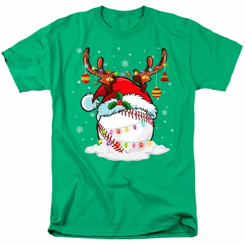 These baseball t-shirts have the Reindeer Santa Claus Hat Baseball Christmas Lights graphics on the front.