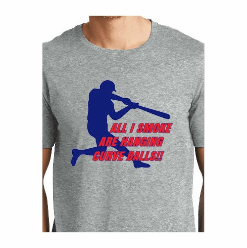 These baseball t-shirts have the All I Smoke Are Hanging Curve Balls! baseball batter graphics screened on the chest. 100% cotton.
